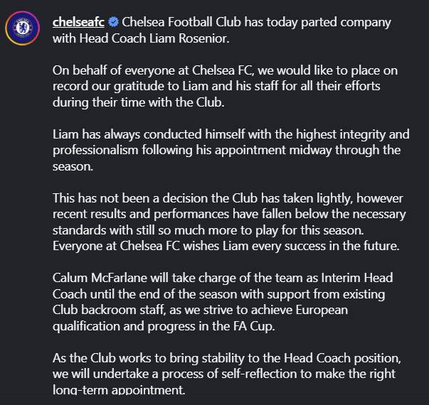 첼시는 "로세니어는 시즌 중반 임명된 뒤 최고의 청렴성과 전문성을 발휘해 왔다"며 그의 노력을 인정하면서도 "구단이 가볍게 내린 결정은 아니다. 최근 결과와 성적이 필요한 기준 이하로 떨어졌고 이번 시즌 아직 더 많은 경기를 해야 한다. 첼시 모든 구성원이 로세니어의 미래에 성공이 있길 기원한다"고 성적 부진이 경질 사유임을 설명했다.