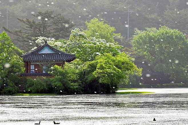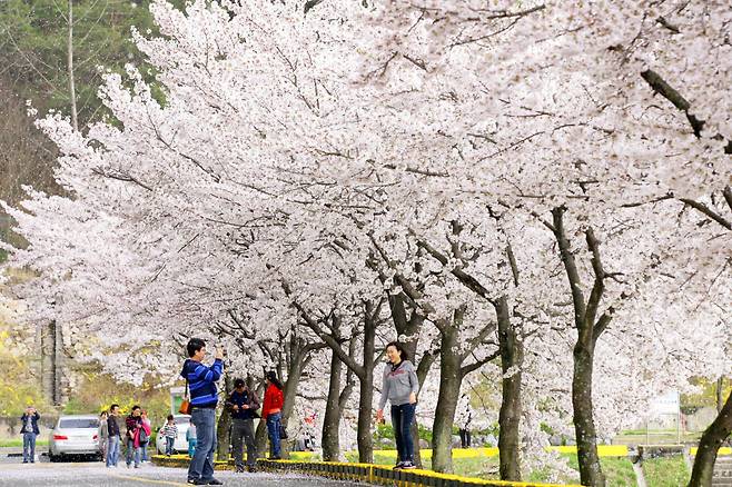 차를 타고 천천히 달리다 보면, 꽃비가 유리창을 타고 흘러내리는 듯한 착각이 들 정도다.