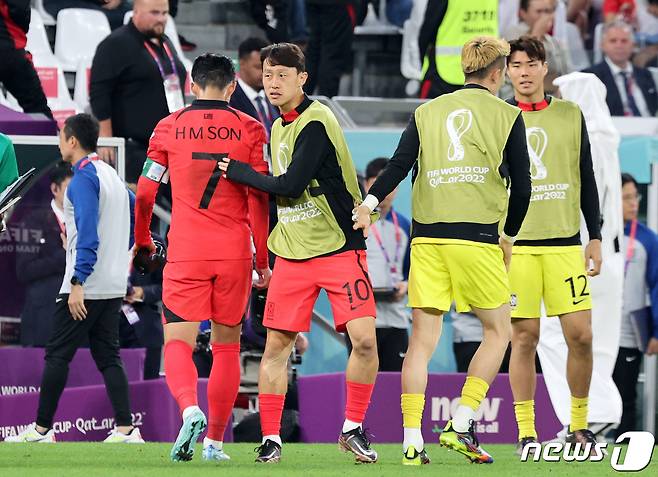 (알라이얀(카타르)=뉴스1) 이동해 기자 = 28일 오후(현지시간) 카타르 알라이얀 에듀케이션 시티 스타디움에서 열린 2022 카타르 월드컵 조별리그 H조 2차전 대한민국과 가나의 경기에서 이재성이 전반전 종료 후 그라운드를 나서는 손흥민을 다독이고 있다. 2022.11.28/뉴스1