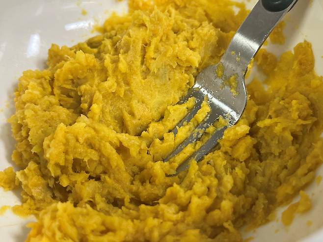 고구마는 포크로 모두 으깨줍니다. 덩어리가 남지 않도록 최대한 곱게 으깨세요. 호박고구마는 수분이 많고 부드러워 포크로도 쉽게 으깨집니다.