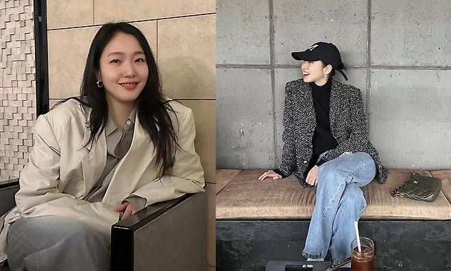 샤넬 트위드 자켓에 데님진을 매치하고, 볼캡을 착용해 캐주얼한 무드로 완성한 김고은 샤넬 가방 코디.