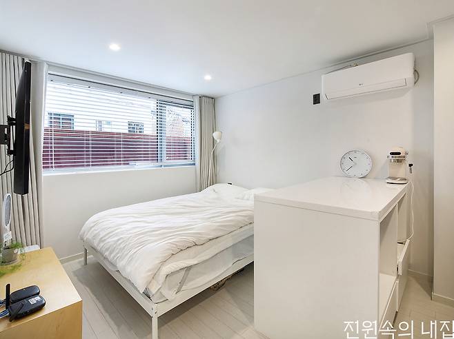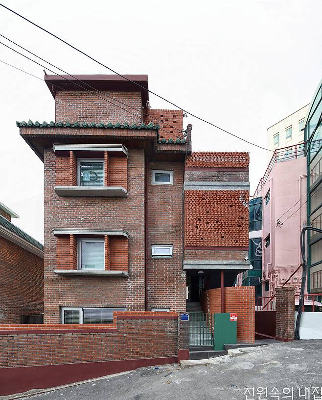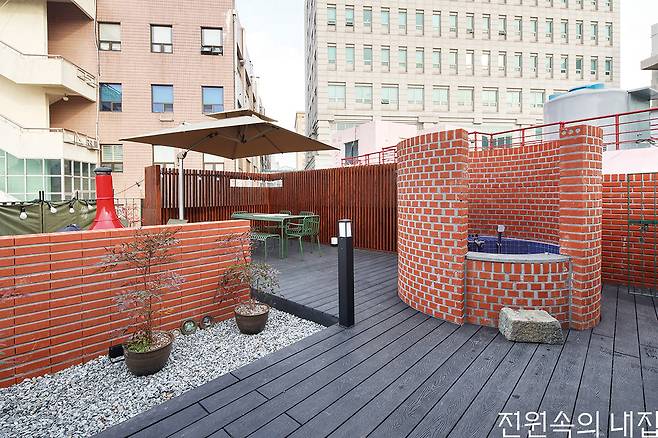 건축가와 건축주는 대수선보다는 큰 구조를 건드리지 않는 선에서 리모델링을 계획했다. 대수선과 증축 프로젝트의 경우 해체와 대수선 작업의 비용이 상황에 따라서는 신축과 맞먹을 정도여서 합리적이지 않다는 판단도 있었다. 리모델링은 우선 걷어내는 것에서 시작했다. 샌드위치 패널을 걷어내고, 외부계단을 감싸던 오래된 금속 섀시를 철거했다. 옥탑을 너저분하게 만드는 요소들도 치웠다. 샌드위치 패널이 걷혀진 곳은 외부공간을 두어 여유를 남겼고, 외부계단 자리에는 쪼갠 벽돌을 쌓아 독특한 질감을 살리면서 기존 벽과 함께 정돈했다. 창문은 기존보다 크기를 줄여 아늑함을 더했다. 옥탑은 주택에 부족한 외부공간으로 바뀌었다. 이곳에서 건축주는 종종 지인과 함께 남산타워까지 보이는 전망을 누리며 즐거운 시간을 보내곤 한다.