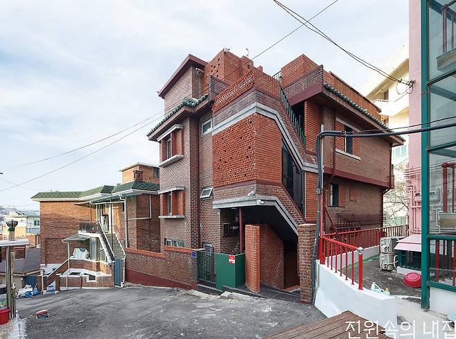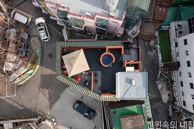 건축가와 건축주는 대수선보다는 큰 구조를 건드리지 않는 선에서 리모델링을 계획했다. 대수선과 증축 프로젝트의 경우 해체와 대수선 작업의 비용이 상황에 따라서는 신축과 맞먹을 정도여서 합리적이지 않다는 판단도 있었다. 리모델링은 우선 걷어내는 것에서 시작했다. 샌드위치 패널을 걷어내고, 외부계단을 감싸던 오래된 금속 섀시를 철거했다. 옥탑을 너저분하게 만드는 요소들도 치웠다. 샌드위치 패널이 걷혀진 곳은 외부공간을 두어 여유를 남겼고, 외부계단 자리에는 쪼갠 벽돌을 쌓아 독특한 질감을 살리면서 기존 벽과 함께 정돈했다. 창문은 기존보다 크기를 줄여 아늑함을 더했다. 옥탑은 주택에 부족한 외부공간으로 바뀌었다. 이곳에서 건축주는 종종 지인과 함께 남산타워까지 보이는 전망을 누리며 즐거운 시간을 보내곤 한다.