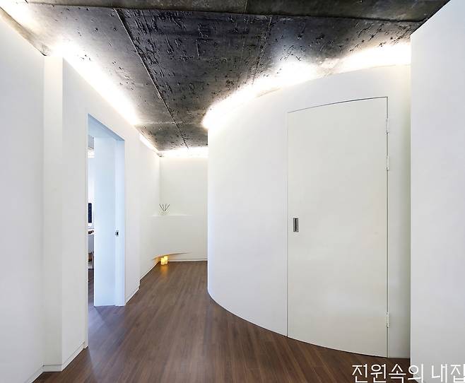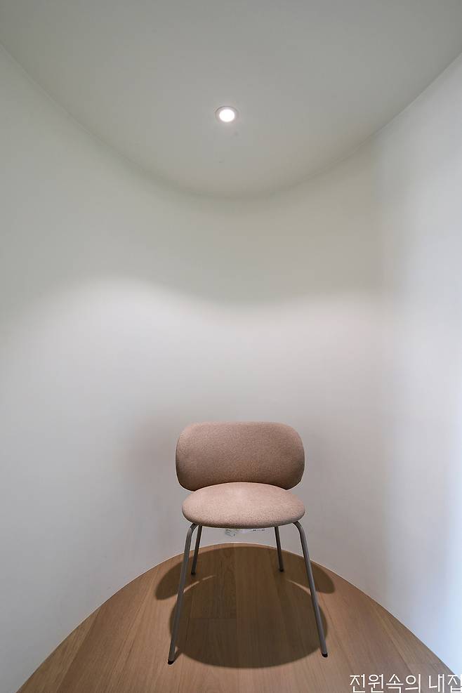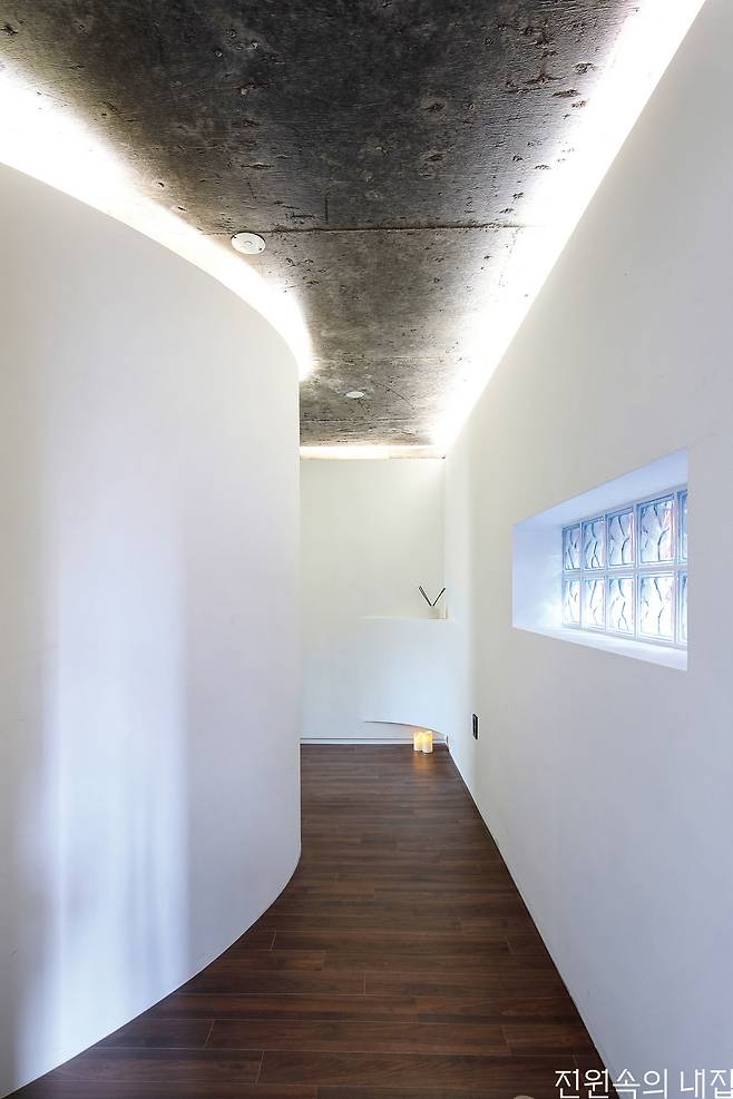 이런 고민은 입구에서부터 시작된다. 내담자가 개인적인 이야기를 풀어내는 곳이면서 프라이버시도 무척 중요한 공간이기에 입구에는 내담자를 감싸듯 완만한 곡선의 벽을 설치했다. 파벽돌을 붙여 벽체와 일체감을 준 출입문을 열어 실내에 들어서면 상담소를 가득 채운 오벌(oval) 형태의 공간을 마주하게 된다. 상담을 마치고 난 후 내담자들은 격해진 감정에 휩쓸리기 마련인데, 이때 이 공간은 마음을 추스르는 데 도움을 주는 일종의 명상실과 같은 역할을 한다. 오벌은 인간이 가장 원초적으로 안정을 취할 수 있는 형태로, 바깥으로부터 빛과 소리, 모든 것이 차단된 안으로 들어서면 아주 미약한 빛과 소리가 라운드 벽을 통해 번지는데, 안에 들어선 내담자는 시간이 멈추는 듯한 경험과 함께 묘한 확장감과 안정감을 가지게 된다. 이 공간은 바깥으로는 자연스럽게 입구에서 상담실로, 상담실에서 명상실로 이어지는 곡면의 긴 동선이 되어주는데, 외부에서 실내로 진입하거나 상담을 마치고 나갈 때 다시 일상으로 들어가며 마음을 정리하는 전이공간의 역할을 한다.