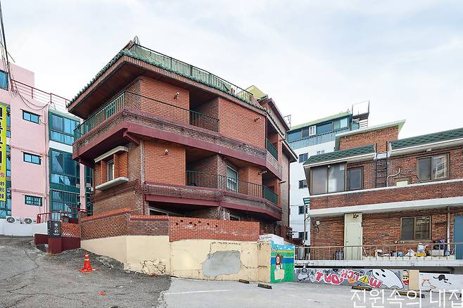 대학가 골목길 흔한 연와조 다가구주택. 건물이 가진 삶을 긍정하고 골목을 존중하며 공간을 새로고침한 흔치 않은 사례다.
