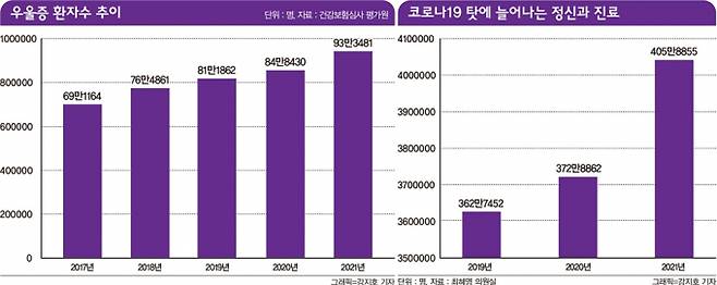 이 가운데 2021년 우울증 환자는 93만3481명으로 2019년(81만1862명)보다 15.0% 증가했습니다.