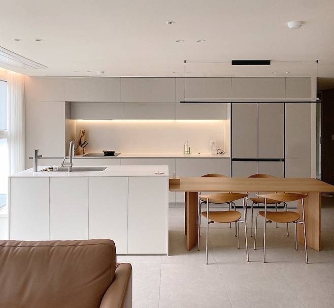 전면을 키큰장으로 채우고 그 앞에는 아일랜드와 식탁을 두었어요. 3m가 넘는 세라믹 아일랜드를 꿈꿨으나 식탁을 둘 공간이 부족하고, 예산 초과라 비용 이슈로 현실 타협했어요. 아일랜드와 식탁을 나란히 두었어요.