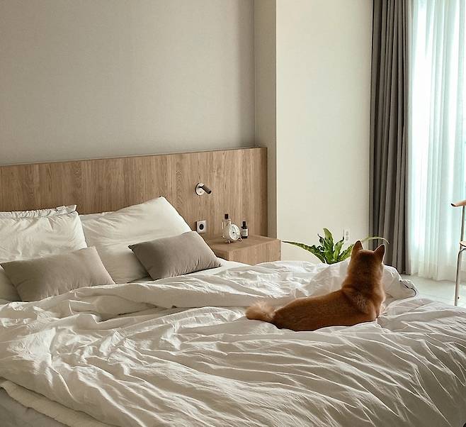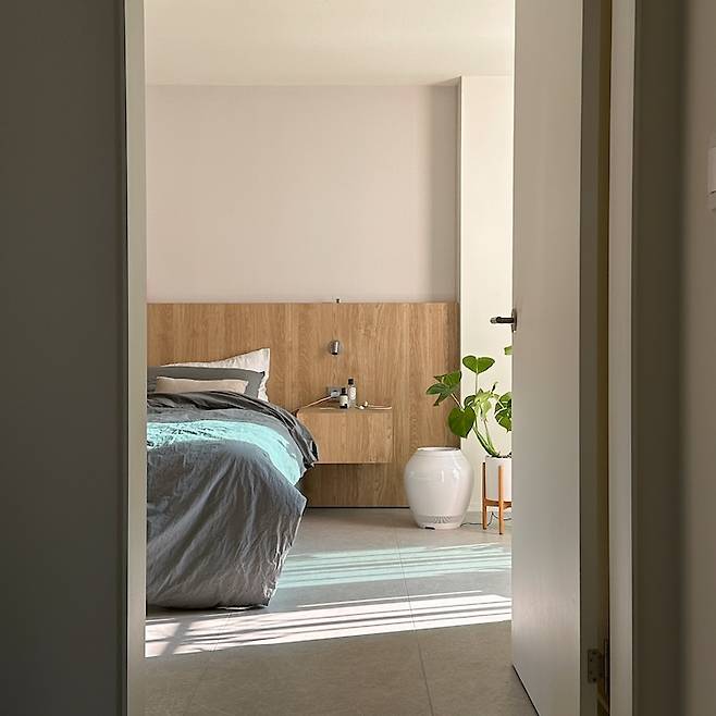 안방은 뻔한 멘트지만 호텔처럼 만들고 싶었어요. 먼지에 취약한 저희 부부를 위해 먼지가 많이 날 수 있는 붙박이장을 따로 짜지 않고 침대가 메인인 공간으로 만들었어요. 업체에서 제작해주신 우드톤 헤드보드와 헤드보드 위 톤다운된 벽지 덕분에 원하던 분위기가 나왔어요.