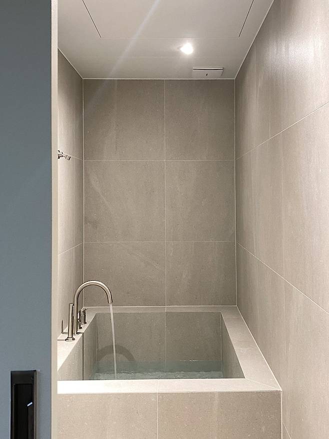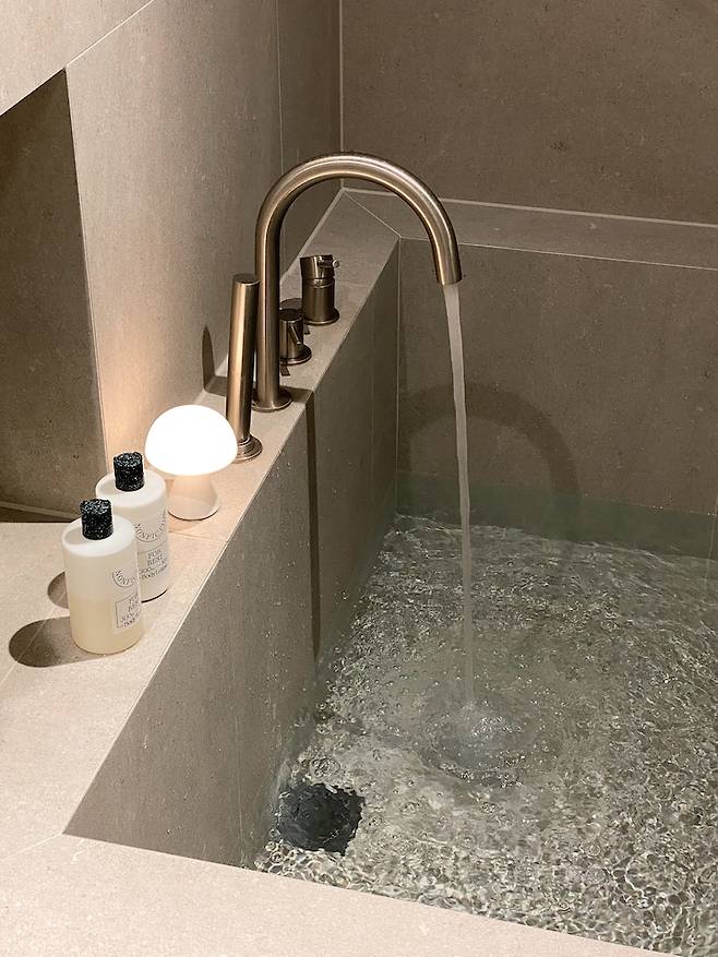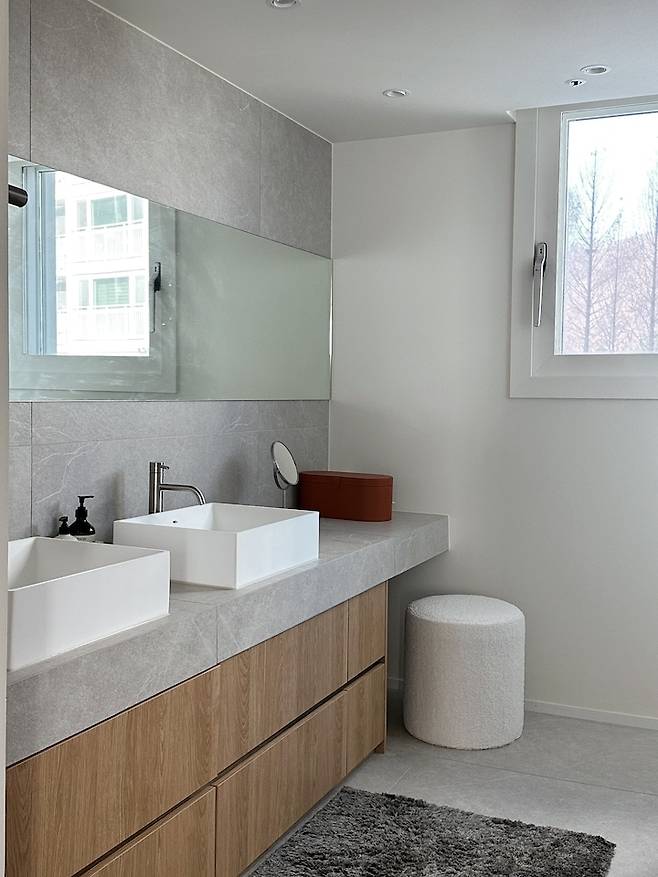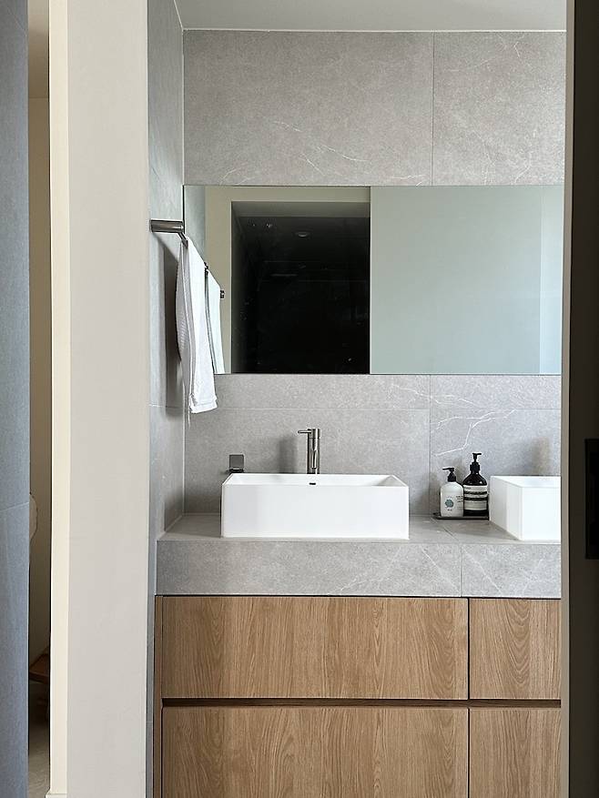 욕조를 꼭 넣고 싶었서 세면대를 밖으로 빼게 된 것도 있어요. 욕조를 넣기엔 화장실이 작아서 큰 욕조를 위해 공간 확보가 필요했어요.