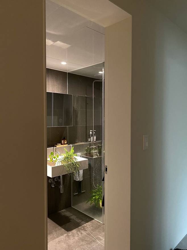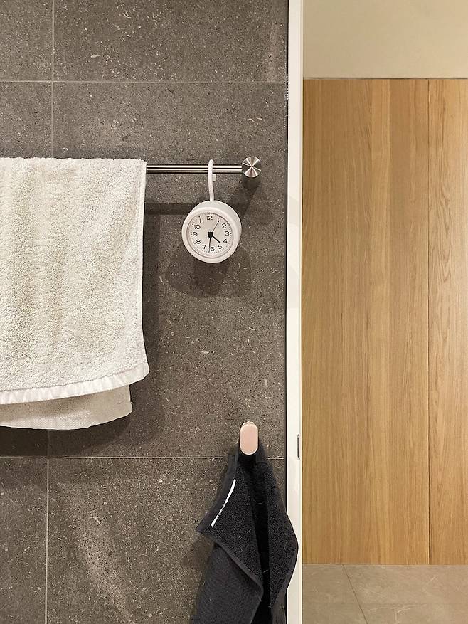 화장실은 어두운게 좋아서 딥한 차콜 컬러의 타일을 사용했어요. 청소도 쉽고 분위기 있어서 만족해요!