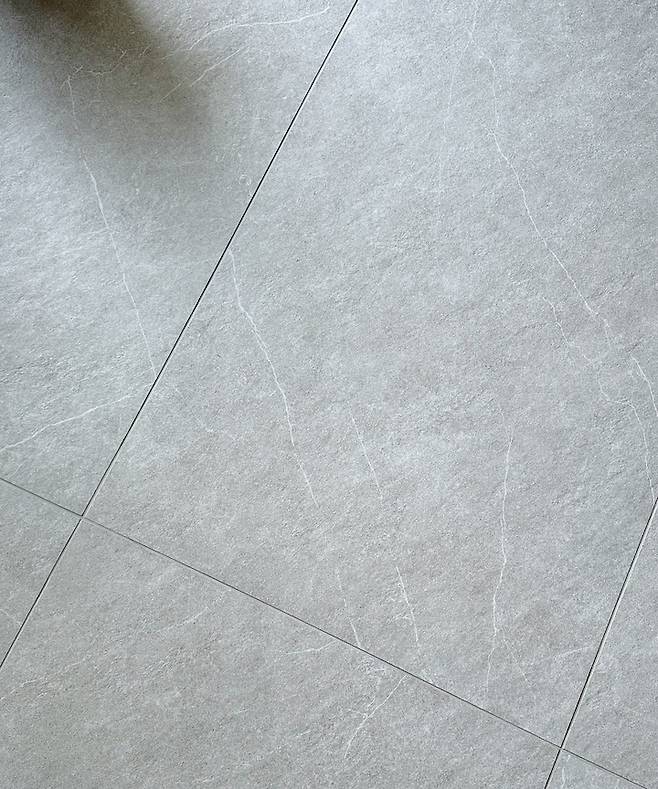 저희집은 집 바닥 전체에 한 가지 타일을 사용했어요. 강아지가 미끄러지지 않는 것을 중점적으로 봐서 컬러나 디자인보다도 거칠기를 먼저 봤어요. 거친 타일들 중에 마음에 드는 디자인으로 골라서 집 전체에 깔았습니다. 600*600 과 600*1200 중에 고민 하다가 넓어 보일 수 있다고 실장님이 추천해주신 600*1200으로 선택했어요.