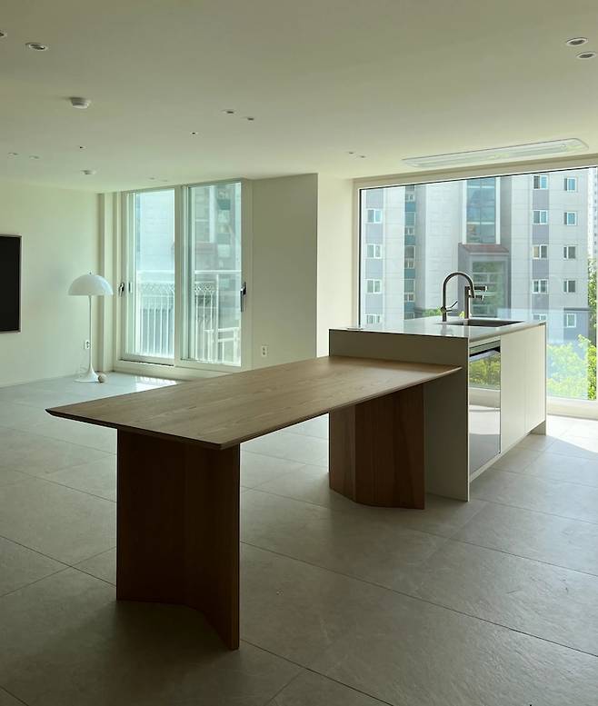 식탁 너머로 보이는 곳은 거실이에요. 사진에서 보이듯, 주방과 거실이 구분 없이 1자 형태로 이루어져 있어요. 넓은 다이닝 공간을 위해 주방 위치를 어떻게 바꿀 지에 대한 고민이 많았는데요, 기존의 거실과 부엌을 맞바꾸는 방식도 고민했으나 거실이 너무 작아져야 했기 때문에 배제했어요.