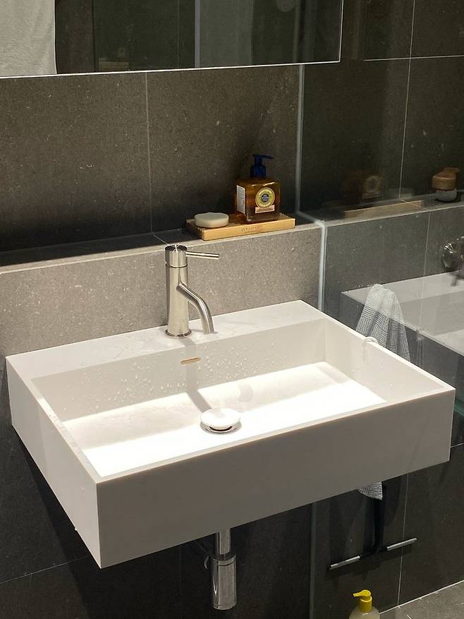 강아지와 산책 후에 강아지를 올려놓고 편하게 발을 닦이기 위해 평평한 네모 모양의 세면대를 선택했어요. 사용하다 보니 무광 제품은 청소가 너무 어렵고 각 모서리가 각진 탓에 이물질이 잘 끼더라고요. 다음에 또 인테리어를 한다면 모서리가 둥근 제품으로 쓰고 싶어요.