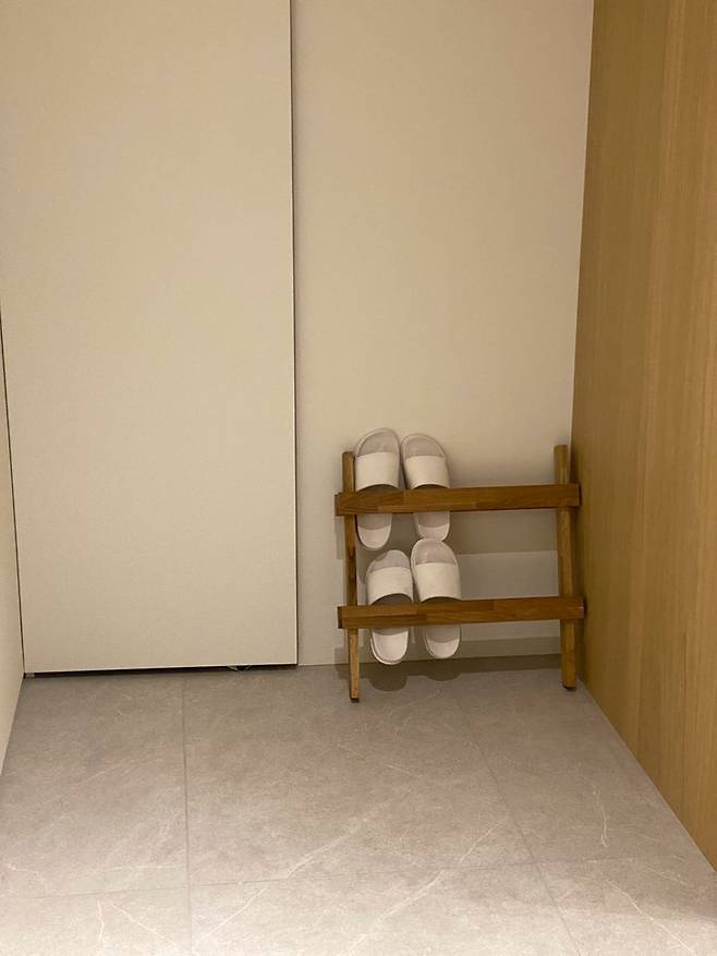 복도 끝엔 이질감 없는 재질의 슬리퍼 거치대를 두었어요.