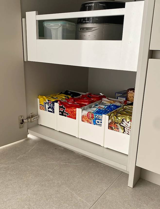 한쪽 벽 전체를 키큰장으로 만들었더니 수납은 아주아주 충분해요. 밥솥, 오븐레인지, 냉장고, 식세기 모두 키큰장과 아일랜드 아래에 잘 숨겨서 쓰고 있어요.