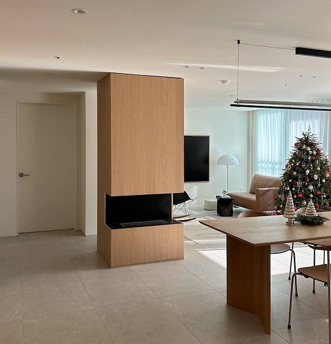 저희집만의 하나의 개성이라고 하면 주방과 거실 사이에 크게 자리한 벽난로예요. 작은 방을 트면서 부술 수 없었던 내력벽은 업체 실장님의 아이디어로 벽난로로 재탄생 했어요.