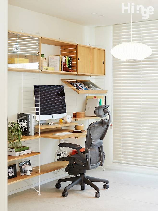 의자 뒤쪽 벽에 지금은 스트링시스템 선반을 설치했어요. 스트링 시스템은 늘 로망이었는데, 가구 편집샵에서 디스플레이 제품으로 구매한 덕분에 40%정도 할인 받아서 구매했어요!