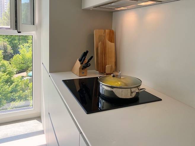 인덕션 공간이에요. 바로 옆에 창이 있어서 요리할 때 환기하기 좋아요.