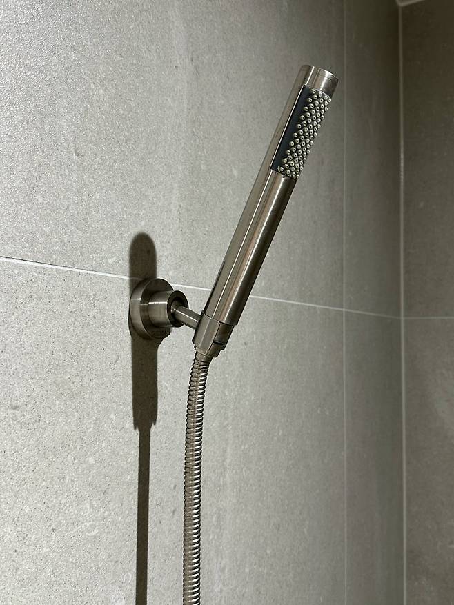 샤워기를 꽂아두면 이런 모습인데요, 물 나오는 수전 왼쪽에 위치한게 샤워기예요. 깔끔하죠?