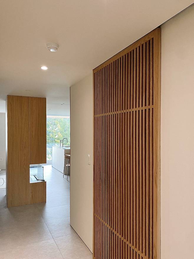 저희집을 처음 들어오면 가장 먼저 들어오는 무늬목 벽이에요. 처음에는 큰 벽 전체를 나무로 덮는게 답답하지 않을까 해서 실장님과 여러번 논의를 했어요. 하지만 막상 시공 후에 보니 집의 무게감을 잡아주는 요소가 돼서 맘에 들어요!