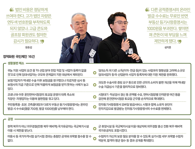 정책화 이행 중에 있는 국민제안의 제안자들도 자리했습니다. D씨는 경력증명서 발급 유효기간의 연장 또는 폐지 방안을 제안했습니다. 경력증명서 발급 시점을 기준으로 이전과 달라진 사실이 없는데도 채용 공고 시 ‘3개월 이내 발급한 경력증명서’를 요구해 구직자들이 어려움을 겪고 있다는 게 골자입니다. D씨는 “청년 변호사들은 다른 업종보다 이직이 빈번하고 다니던 법률사무소가 폐업하는 경우도 있다. 대체로 서류 보관기관이 3년이다 보니 그 이전의 경력증명서를 떼는 게 불가능할 때도 있다. 이런 문제를 시정해달라는 제안을 하게 됐다”고 덧붙였습니다. 이와 관련해 정부는 경력증명서 발급 유효기간을 연장하거나 폐지할 수 있도록 공정채용 컨설팅·교육 등을 지원할 계획입니다.