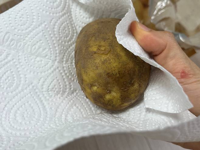 감자는 한 개씩 따로 키친타월이나 신문지로 감싸 주세요. 이렇게 하면 감자끼리 닿지 않아 덜 무르고, 습기나 통풍에도 더욱 효과적입니다.
