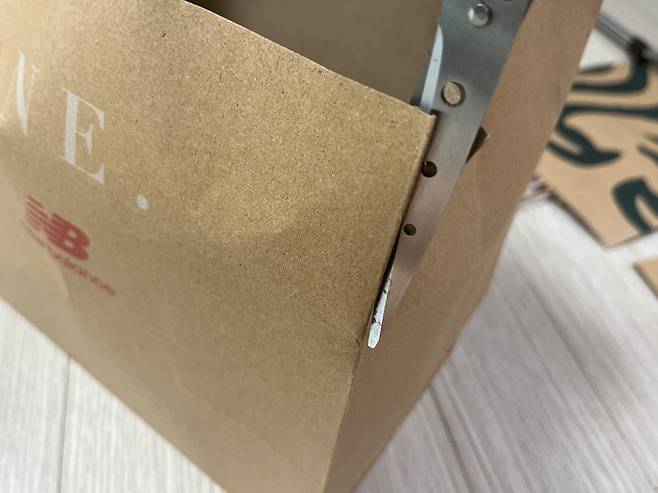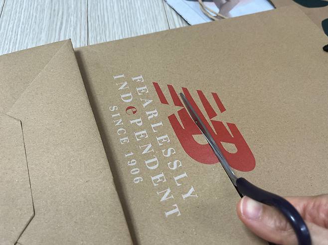 집에 가지고 있는 종이백 중 크래프트지로 된 종이백을 준비해 주세요. 그리고 약 1/2 지점을 가위로 잘라 주세요.