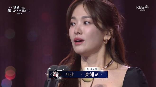 트로피를 들고 무대에 오른 송혜교는 "'더 글로리' 촬영이 끝나고 1년이 가까이 되어 간다"며 "스태프분들께 정말 감사드린다고 인사를 드리고 싶은데, 이제 그 때 스태프분들이 뿔뿔이 흩어져서 각자 다른 촬영장에 계시기 때문에 인사드릴 기회가 없었는데, 이렇게 좋은 상으로 멋진 자리에서 감사인사를 드릴 수 있게 되어서 너무나 행복하다"고 말했다.