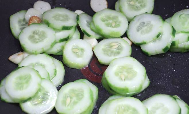 이때 중요한 포인트는 절대 오래 볶지 않는 것인데요, 오이를 오래 익히면 수분이 나오고 물러지기 때문에 오독오독한 식감을 원한다면 최대 1~2분 볶아주세요.