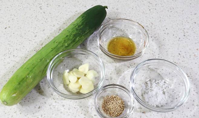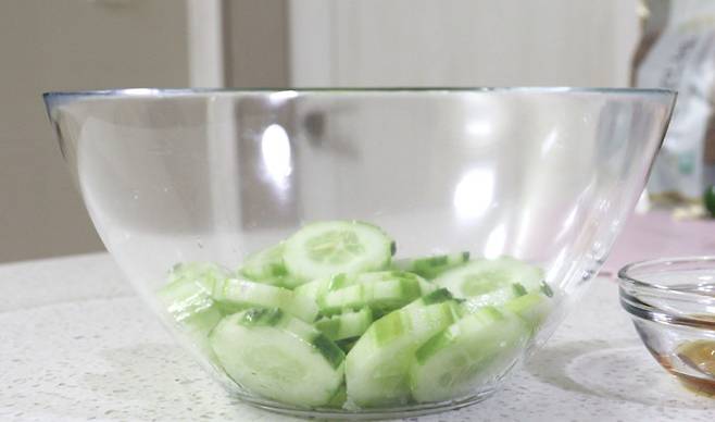 흐르는 물에 오이를 두세번 헹구고 체에 밭쳐 물기를 최대한 제거해 주세요