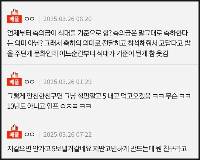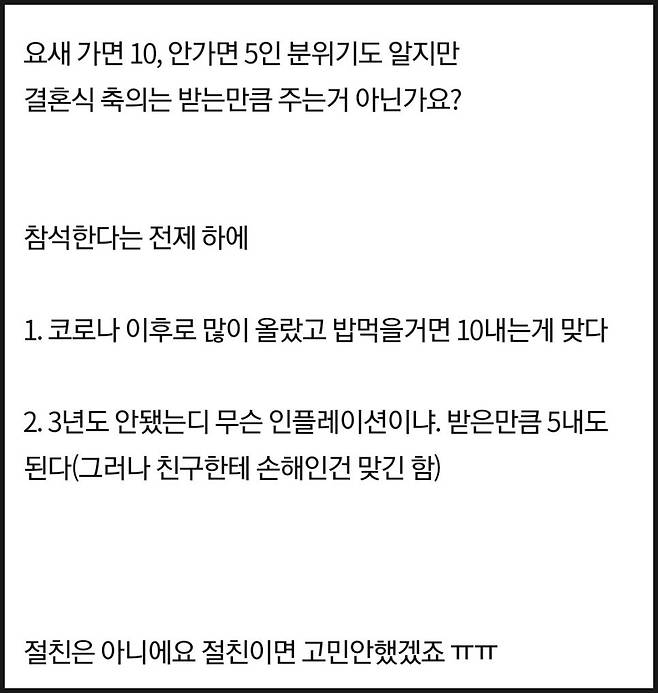 "안친한 친구면 5만 원 내고 먹고 오겠음. 10년도 아니고 인플레이션은 무슨...":