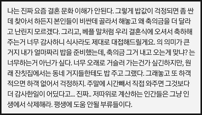 "축의금이 식대 기준이 된 게 웃김. 축하의 의미가 중요하지 않나?":
