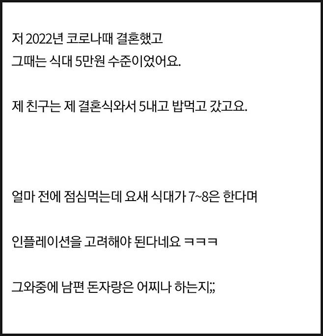 "코로나 때 결혼식에 5만 원 내고 왔는데, 요즘은 7~8만 원, 심지어 10만 원도 한다며 인플레이션을 고려해야 한다?"