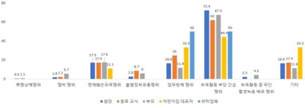 권리침해 유형으로는 보육활동 부당 간섭, 업무방해, 기타, 명예훼손·모욕 등을 주로 꼽았다.