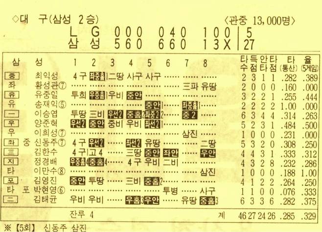 첫날 경기는 예고편에 불과했다. LG는 5월 4일 삼성에 홈런 9개를 헌납하며 5-27이라는 치욕적인 스코어로 참사를 당했다. 27점은 당시 KBO 한 경기 최다득점 신기록이었다(이 기록은 27년 후인 2024년 7월 31일 광주에서 두산이 KIA에 30-6으로 이겨 역대 2위로 물러났다).