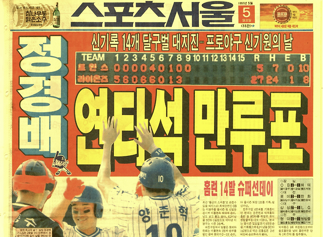 『4일 삼성과 정경배가 빅뱅을 일으키며 대구구장에선 홈런포 10개가 쉴 새 없이 작렬, 무려 14개의 기록이 쏟아졌다. 삼성은 홈에서 재계 라이벌이자 선두인 LG를 맞아 정경배의 프로통산 1호 연타석 만루홈런 등 9발의 홈런을 쏟아부어 27-5로 대승을 거뒀다.』
