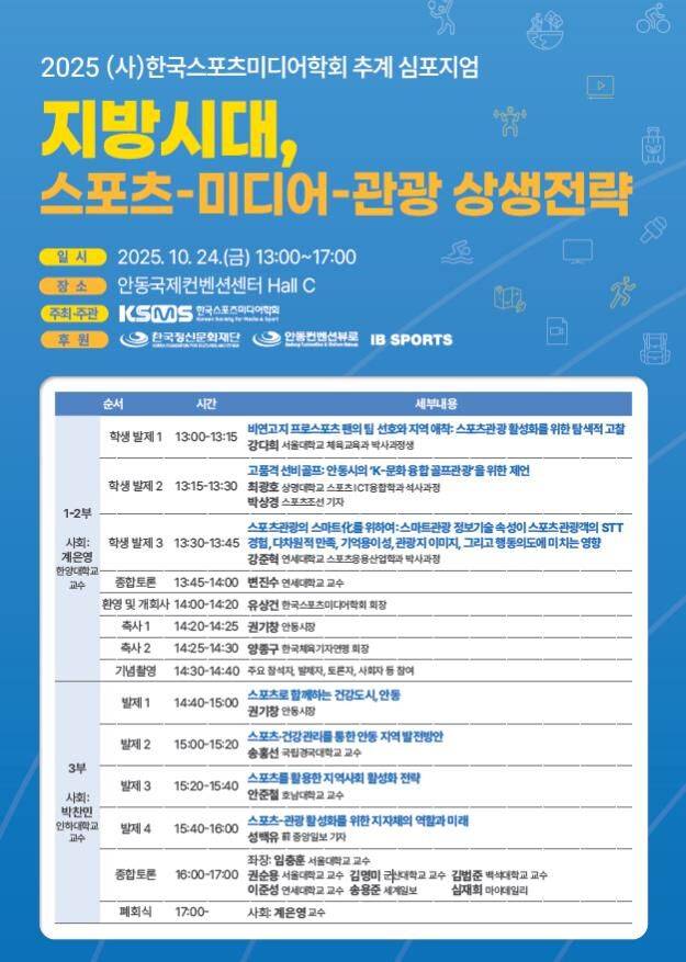 유상건 스포츠미디어학회 회장은 "이번 심포지엄을 통해 한국 사회가 직면한 지방 소멸 문제 해결의 단초를 찾아보고 싶다. 특히 스포츠를 통한 건강 도시 조성, 안동시를 위한 'K-문화 융합 골프' 등 스포츠, 미디어, 관광이 상생하는 정책적 제안이 나올 것으로 기대한다"고 말했습니다.
