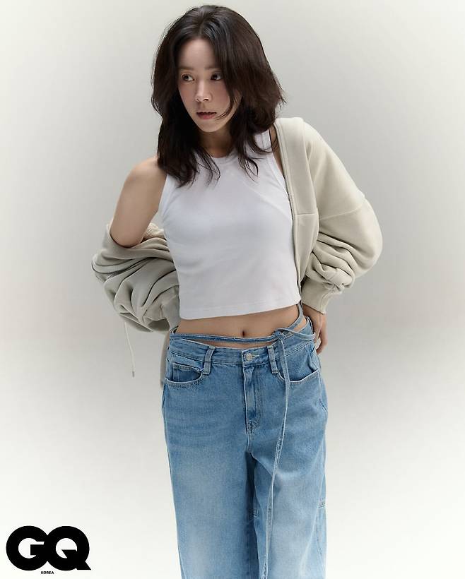 한지민은 화이트 크롭 탑과 베이지 오버사이즈 가디건, 그리고 블루 데님 팬츠를 매치하여 편안하면서도 세련된 룩을 연출하고 있다. 특히 크롭 탑의 짧은 기장과 루즈한 가디건의 대비가 레이어드의 묘미를 보여주며, 클래식한 데님과의 조화로 일상 속 모던함을 표현하고 있다.