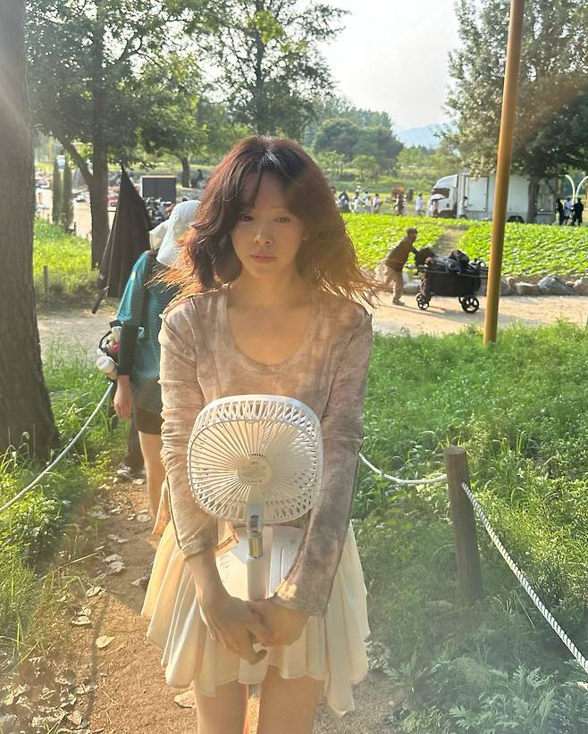 야외 촬영장에서 한지민은 베이지 톤 니트와 화이트 플리츠 스커트로 온화하고 여성스러운 분위기를 자아내고 있다. 휴대용 선풍기를 들고 있는 자연스러운 모습에서도 소프트한 컬러 팔레트가 돋보이며, 니트의 부드러운 질감과 스커트의 플리츠 디테일이 로맨틱한 감성을 극대화하고 있다.