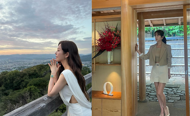 석양을 배경으로 한 한지민은 화이트 컷아웃 원피스로 우아한 실루엣을 완성하고 있다. 허리 부분의 절개 디자인이 모던한 포인트를 주며, 골드 시계 액세서리가 세련된 마무리를 더하고 있다. 자연광과 어우러진 화이트 컬러가 청순하면서도 고급스러운 이미지를 연출하고 있다.