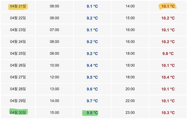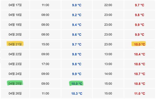 최저 서식 수온인 10도가 되는지를