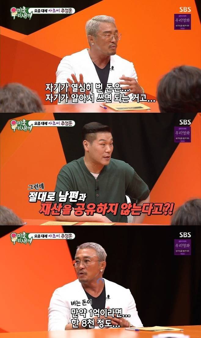 “만약 1억 원을 벌면 8천만 원으로 줄여서 말하겠다”는 추성훈! 아내 수입이 궁금하지 않은 이유에 대해 “그걸 달라고 하는 것도 이상하잖아?”라고 덧붙였어. 🤔 가족 단체 소비는 추성훈이 담당하지만, 개인 소비는 철저하게 각자 알아서 한다고 해. 👍