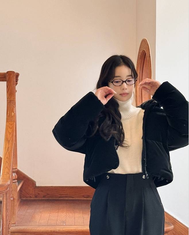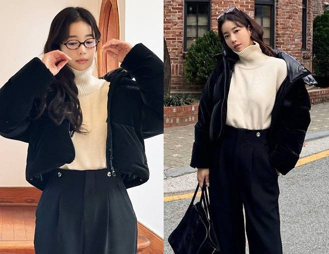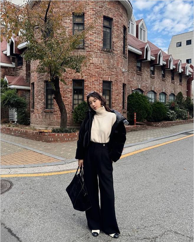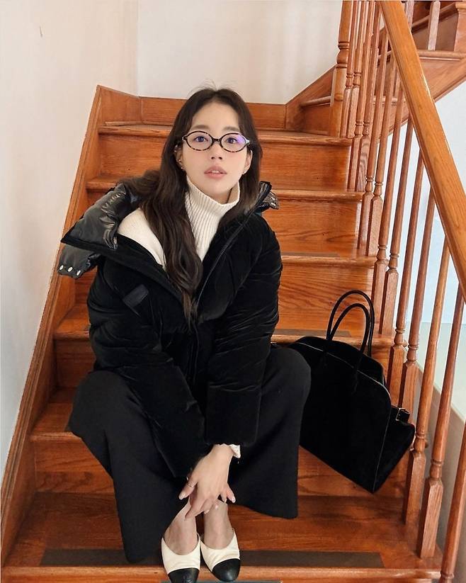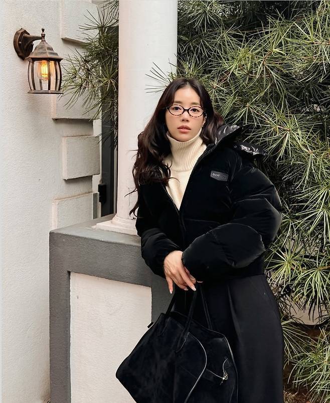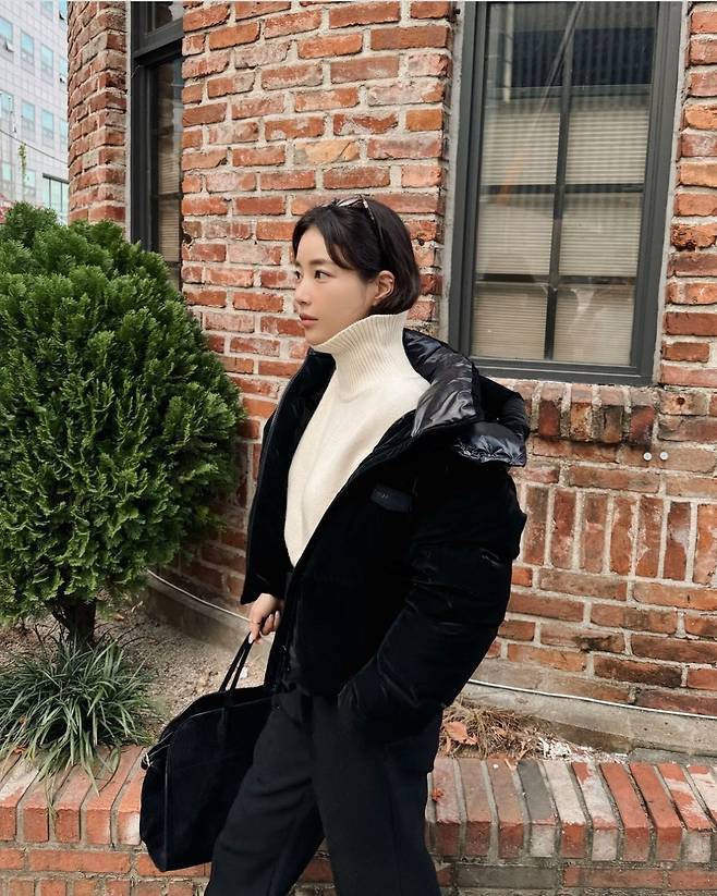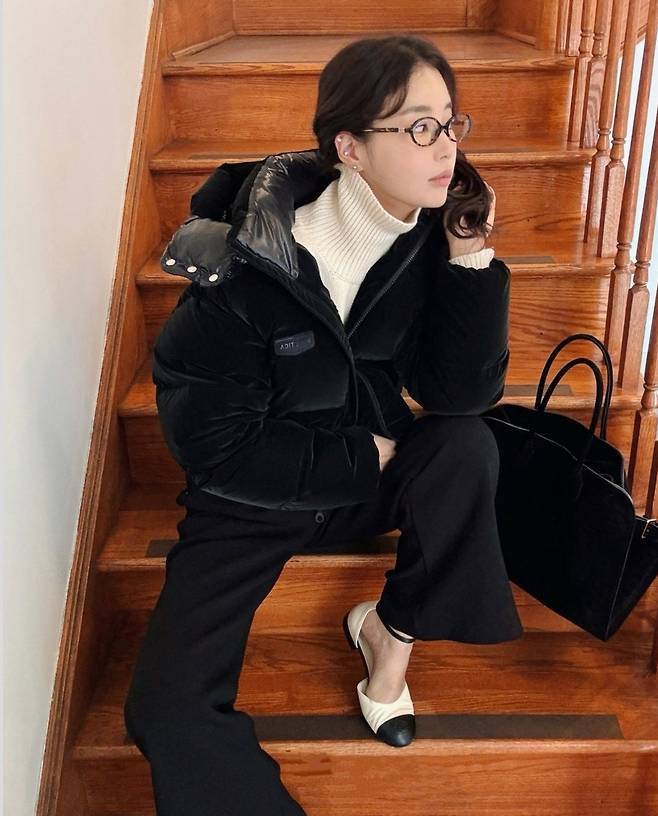 여기에 기은세는 블랙 벨벳 숏패딩을 착용해 고급스럽고 스타일리시한 포인트를 주었습니다.