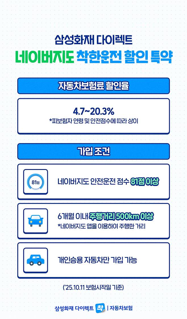 안전운전도 하고 자동차보험료도 할인 받을 수 있는 삼성화재 다이렉트 네이버지도 착한운전 할인 특약! 오늘부터 네이버지도 안전운전 점수를 체크하며 안전한 운전습관과 자동차보험료 절감까지 함께 누려보세요!