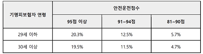 단, 할인율은 기명 피보험자의 연령과 안전운전 점수에 따라 달라지니 정확한 내용은 아래의 표를 통해서 확인해주세요.
