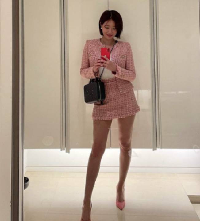 샤넬 스타일의 체인백을 매치하면 우아한 스타일이 완성된다.