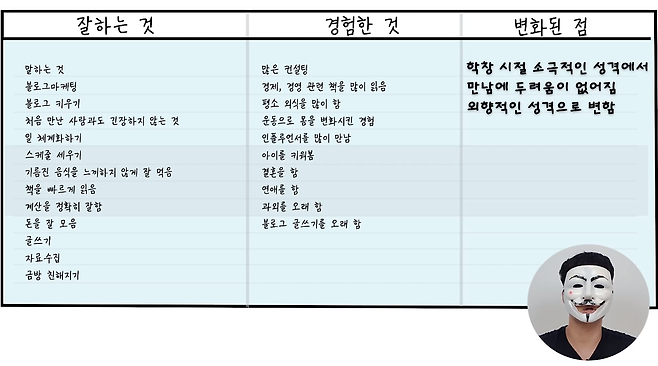 머니테이커가 과연, 주변 지인의 월 1,000만 원 번다는 이야기만을 듣고 무작정 블로그 마케팅 대행에 도전했을까? 그건 아니었다. 머니테이커는 본인의 1인 사업을 시작하기 위해 스스로에 대해서 가장 잘 아는 것이 중요하다고 보았다. 머니테이커는 1인 사업의 재료를 찾기 위해 가장 중요한 것으로 '잘하는 것', '경험한 것' 그리고 '변화된 점'을 꼽았다. 그럼 한번 하나씩 살펴보자.