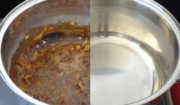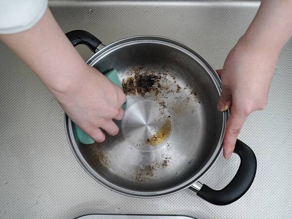 5단계: 시간이 지난 후 부드러운 수세미나 스폰지로 냄비 바닥을 살살 문질러 찌든 때가 떨어지도록 합니다.