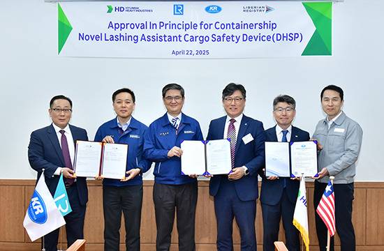 HD현대중공업은 22일 울산 본사에서 영국 로이드선급(Lloyd’s Register), 한국선급 및 라이베리아기국(Liberian International Ship & Corporate Registry)으로부터 컨테이너선의 ‘래싱(Lashing) 보조 화물 안전장치’에 대한 기본승인(Approval In Principle)을 획득했다.
