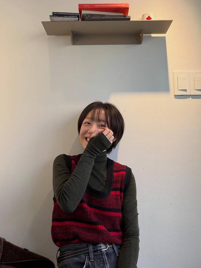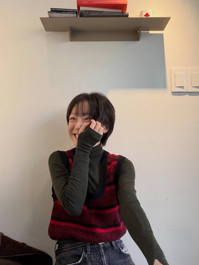 공개된 사진 속 그녀는 따뜻한 카키색 폴라티 위에 붉은 줄무늬 니트 베스트를 겹쳐 입었습니다. 몸에 자연스럽게 감기는 니트 소재와 목을 감싼 디자인이 다가오는 계절감을 강조했습니다. 그녀는 살짝 워싱이 들어간 진회색 데님을 착용해 캐주얼하면서도 세련된 실내룩을 완성했습니다.